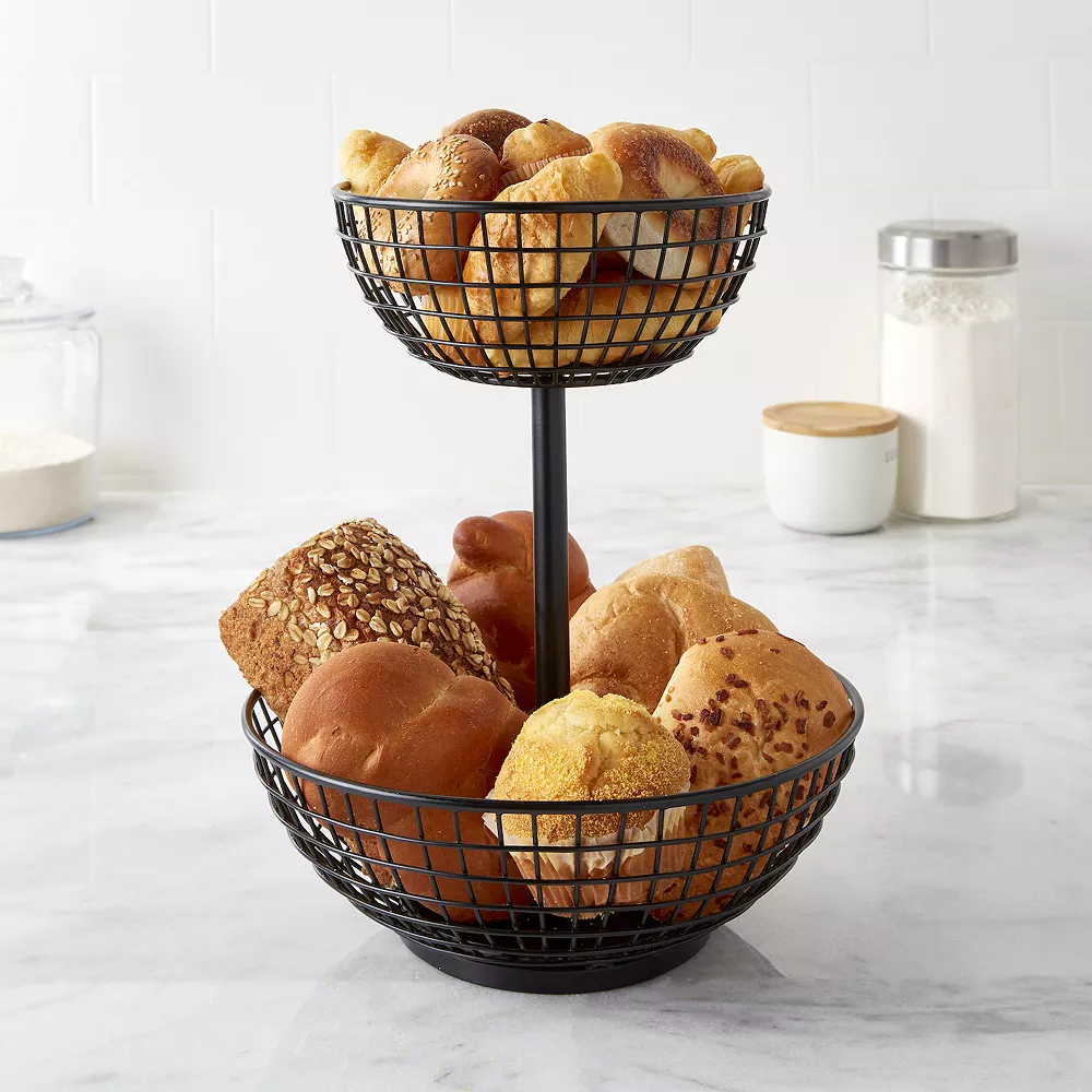 Store fruit on your countertop or create a mealtime centerpiece for dinner rolls and more with this tiered basket from Food Network.